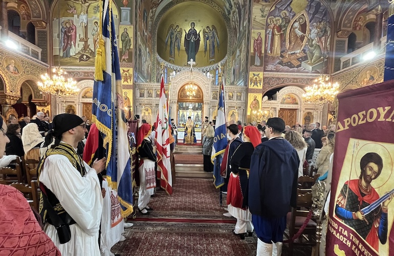Στον Καθεδρικό Ιερό Ναό Αγίας Τριάδος Πειραιώς, εψάλη η Πανηγυρική Δοξολογία, Χοροστατούντος του Σεβασμιωτάτου Μητροπολίτου Πειραιώς κ. Σεραφείμ, ο οποίος αμέσως μετά τέλεσε επιμνημόσυνη Δέηση υπέρ αναπαύσεως των εν τοις ιεροίς του Έθνους ημών αγώσι κεκοιμημένων στην πλατεία Καραϊσκάκη.